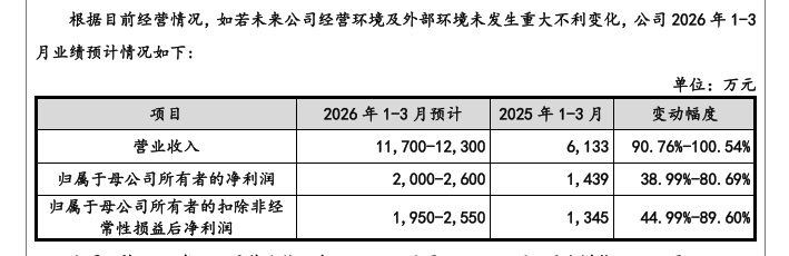 据公司最新上会版招股书披露,广泰真空业绩有望延续高增长态势:2026 年 1—3 月预计实现营业收入 1.17 亿元至 1.23 亿元,同比增长 90.76% 至 100.54%;预计归母净利润 2000 万元至 2600 万元,同比增长 38.99% 至 80.69%。