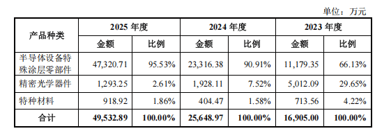 从公司业务构成来看,半导体设备特殊涂层零部件是其营收与利润的核心来源。2023 至 2025 年,该业务板块营收占比逐年攀升,分别为 66.13%、90.91% 及 95.53%,可见公司战略重心持续聚焦于这一核心领域,也成为拉动整体经营业绩稳健增长的关键动力。